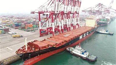 1月4日,曲航新航路首班船舶靠泊山东口岸青岛港,标记着该港2026年首条外贸新航路正式开通。图为曲航新航路首班船舶——“地中海杰西尼亚”轮靠泊山东口岸青岛港。发(刚 摄)。